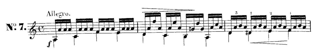 Therefore, a piece such as Etude #7 from Carcassi’s op. 60 (first published 1836) would not be a tremolo piece, since measure 2 and 3 would break the p-a-m-i pattern. The “tremolo-looking” pattern of measure 1 occurs only sporadically throughout the etude.