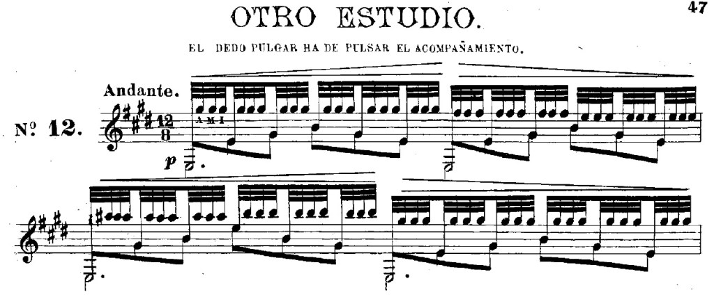 The young Tárrega did move to Barcelona, but ended up taking only a few lessons from Arcas. The p-a-m-i tremolo, however, can be found in Arcas’s Funeral March de Thalberg, Fantasia Sobre La Traviata, and El Delirio (as mentioned, Cano also has a tremolo piece called El Delirio. Tremolo makes people crazy?)
