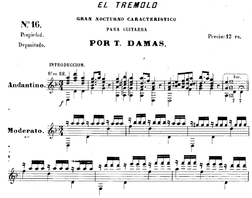 Exploring the connection between Cano and Tárrega, I came across a site dedicated to Tárrega, and it mentions Tomas Damas (ca.1817-1880), who wrote a tremolo piece called El Gran Tremolo (1872, score, video) – looks a bit like Cano’s El Delirio?