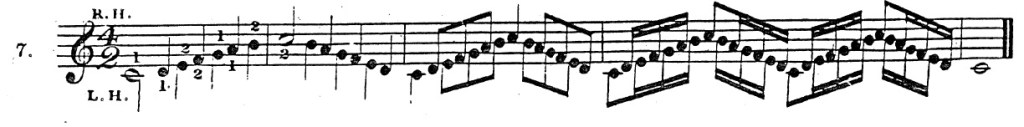As shown above, one would alternate between two hands to play a scale – downward stems are played by the left hand, and upward stems by the right. This “divides between the two hands the work which on other instruments must be done by one hand, hence the capability of the Concertina for rapid execution, for extended intervals and for the endless combinations of three, four and more simultaneous parts.”