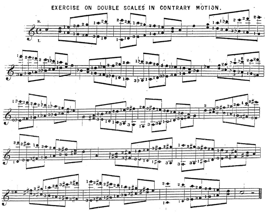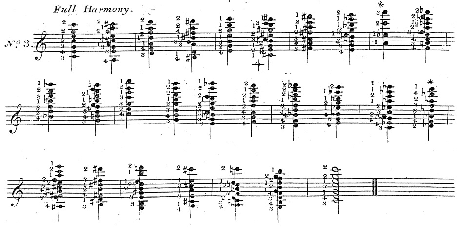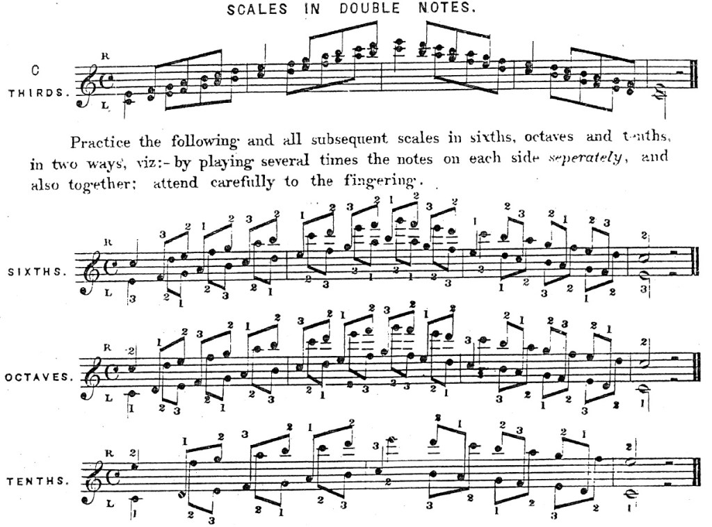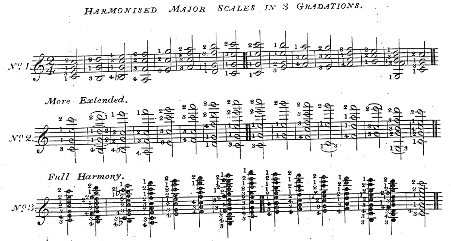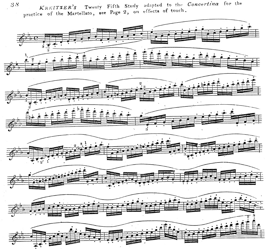 Like many 19th century guitar methods, Regondi’s concertina method devoted a section into the studies of thirds, sixths, octaves, and tenths. The stem directions make these exercises pretty for the eyes, but chaotic for the player:
