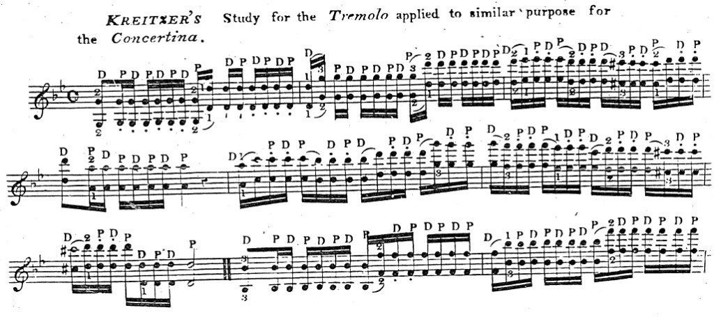 The Rudimenti Del Concertinista is a slightly shorter method. Unlike the method, the Rudimenti included etudes and pieces by famous composers that were adapted for the concertina. One of these etudes is for tremolo (he sure loved tremolo…):